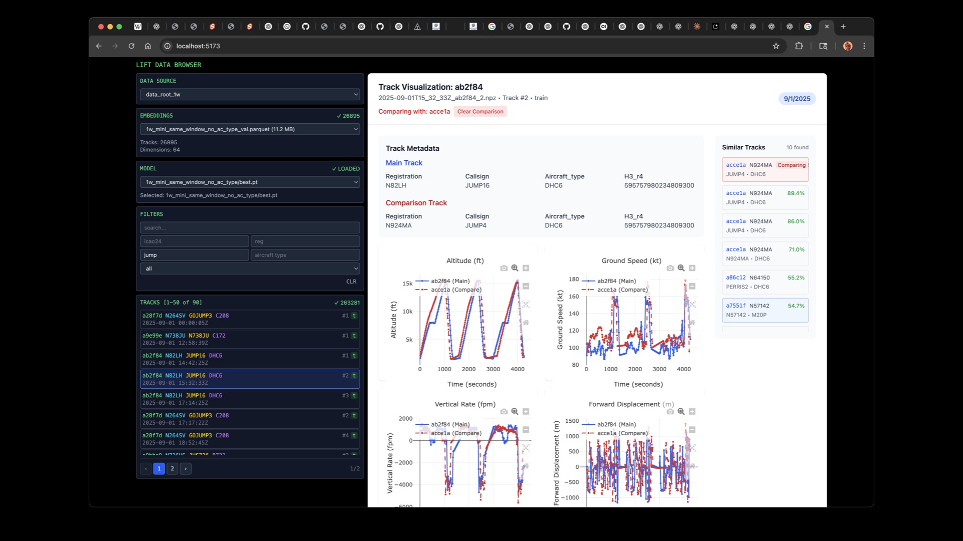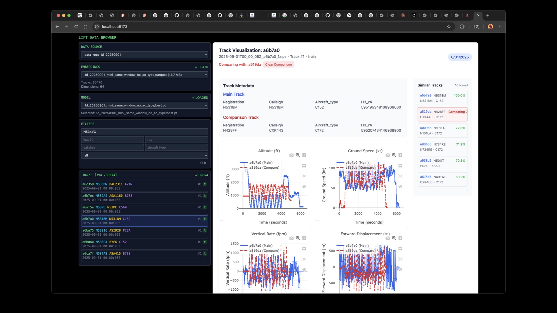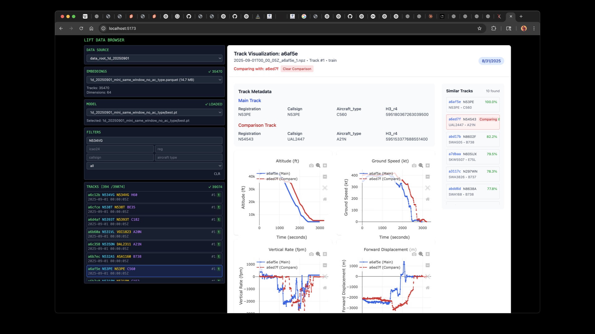 A useful aircraft embedding model unlocks a lot of interesting and valuable use cases, similar to how word2vec and text embeddings unlocked a whole class of semantic search, clustering, retrieval, anomaly detection, and analogy-style reasoning over language—except now the same kind of latent structure becomes available for aircraft behavior, trajectories, and operational patterns. # |