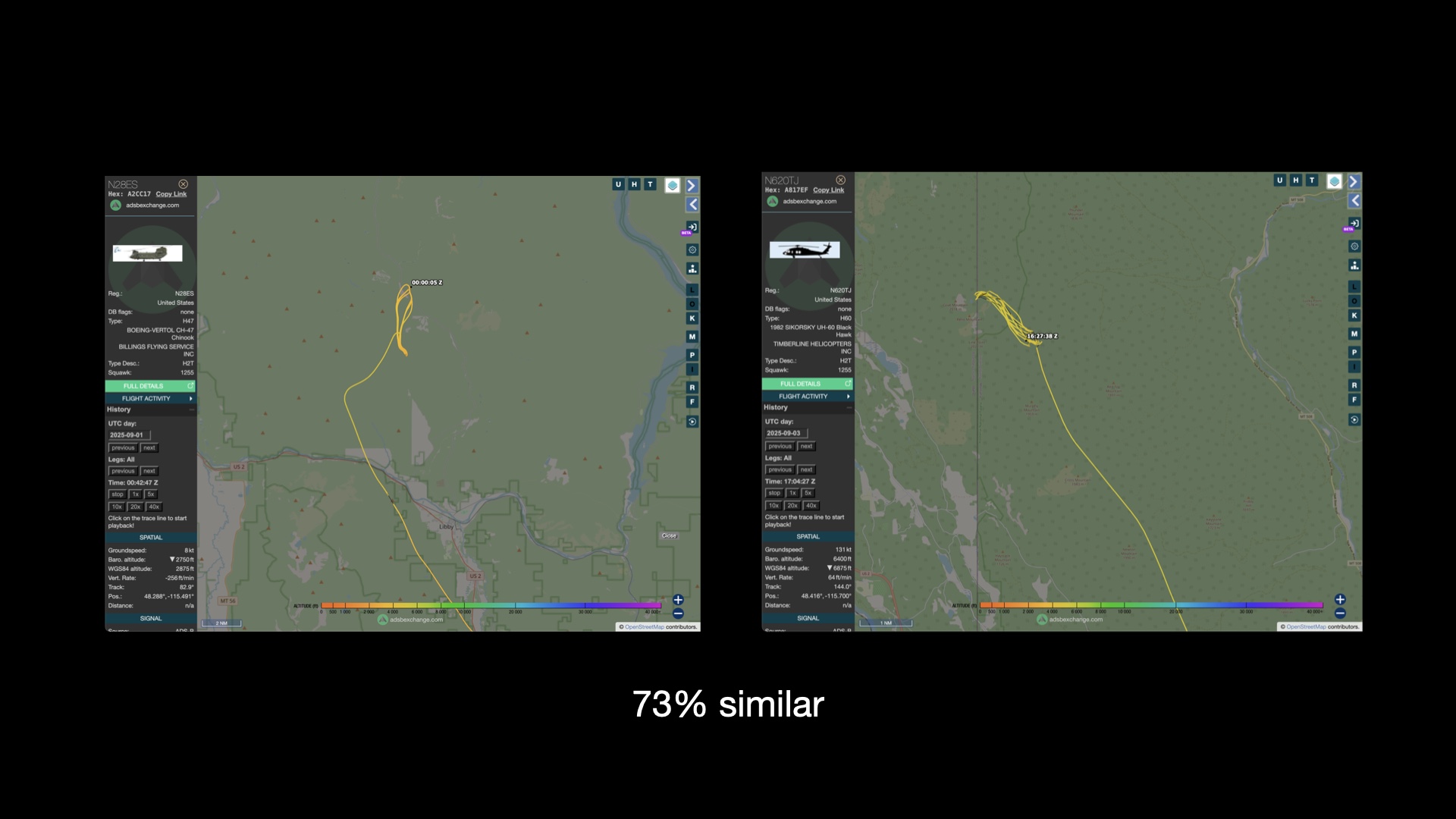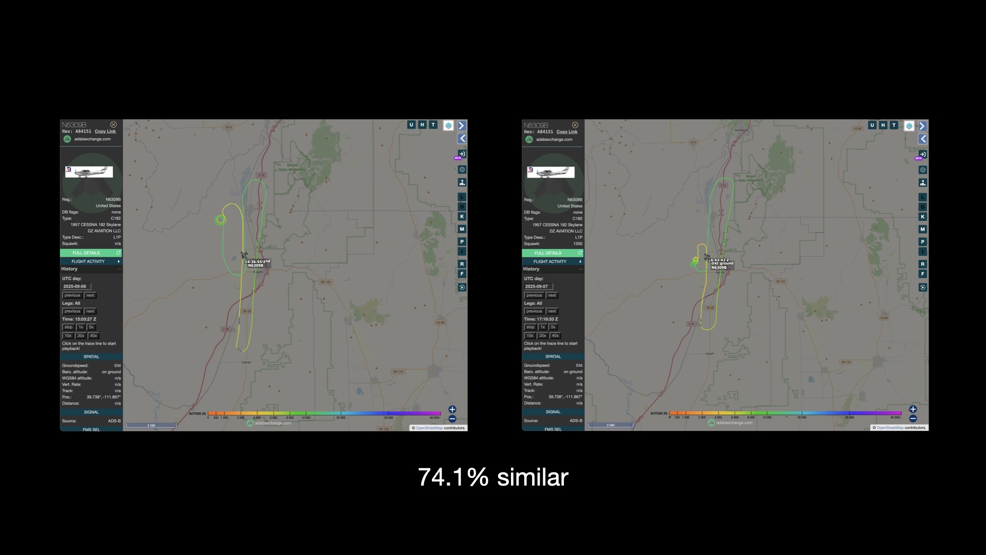 These are two different aircraft on two different days, dropping sterile fruit flies on different parts of Los Angeles. There are many other aircraft flying these sorts of lawnmower patterns, for example doing LIDAR collection, but it determined the one on the right is the most similar. # |