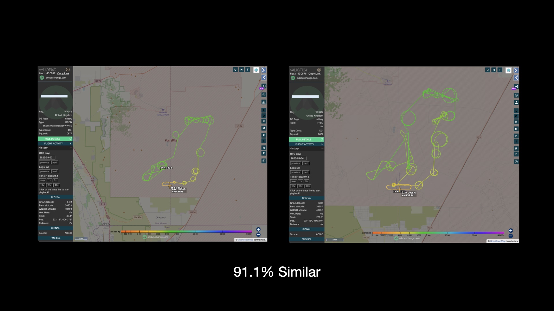 These are two different Thales Watchkeeper drones, flying on different days over Fort Bliss. As a reminder, I chose the track on the left and then the system searched the database in a fraction of a second and determined that the track on the right was most similar to it. # |
